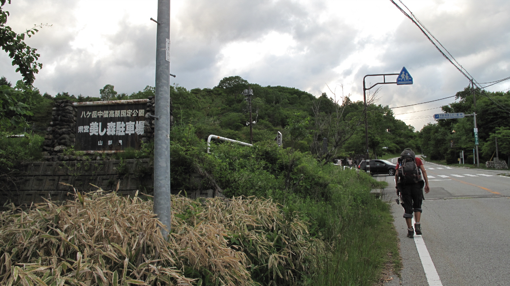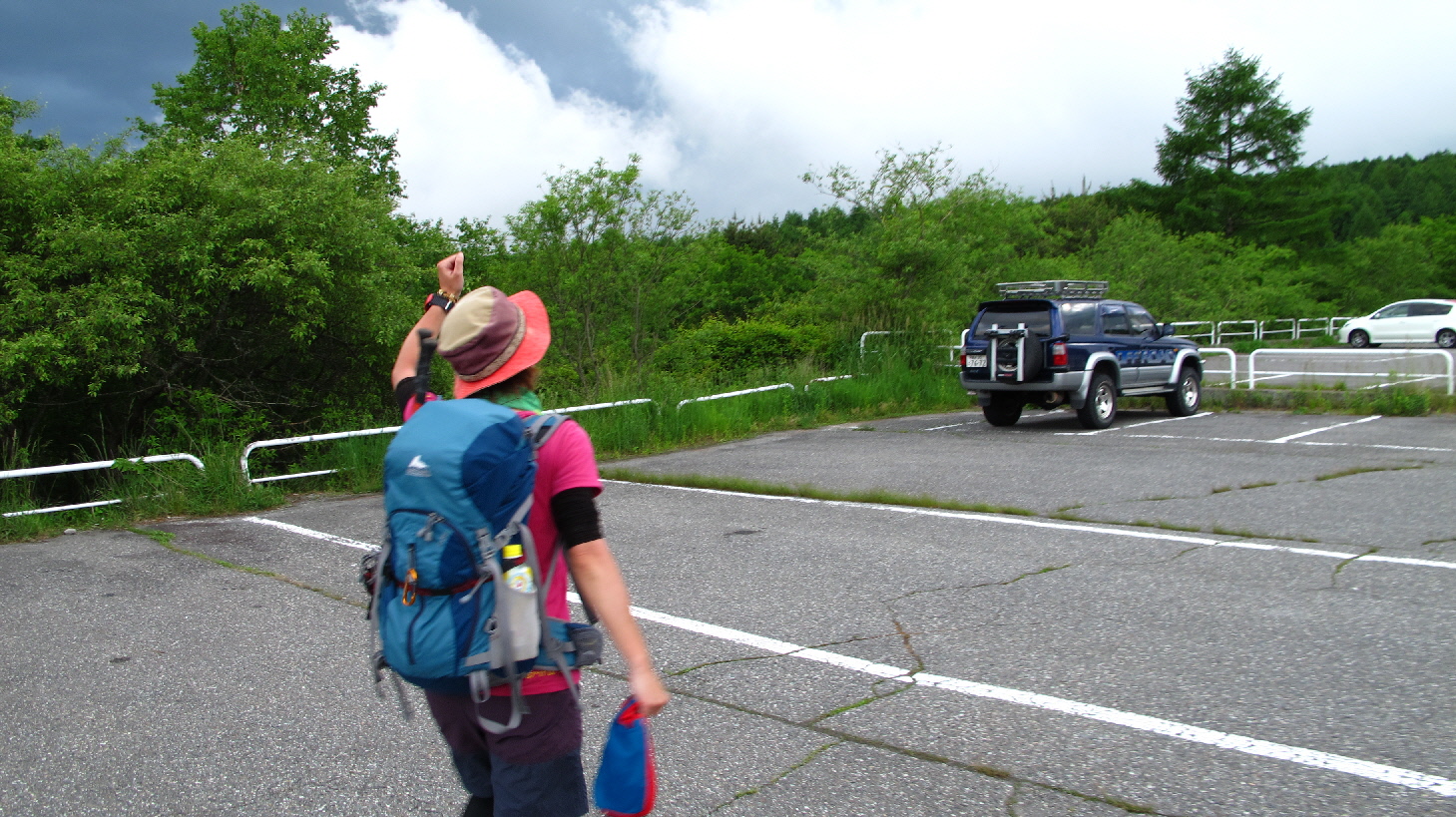 もくもくと歩き、カーブを曲がるとその先に美し森駐車場が見えました