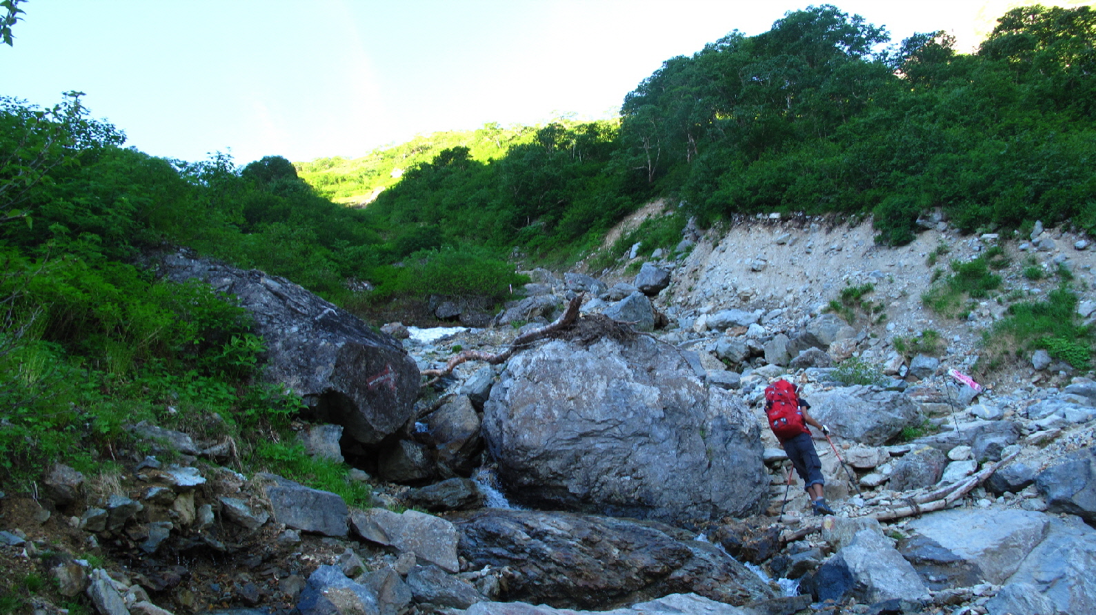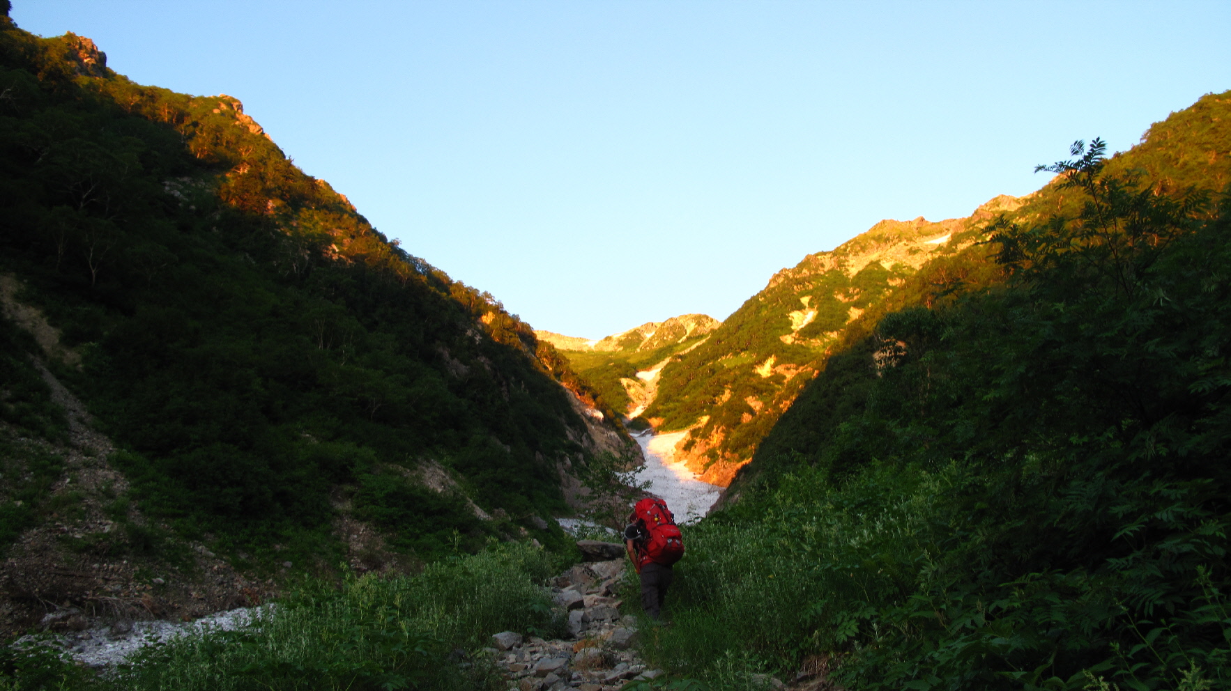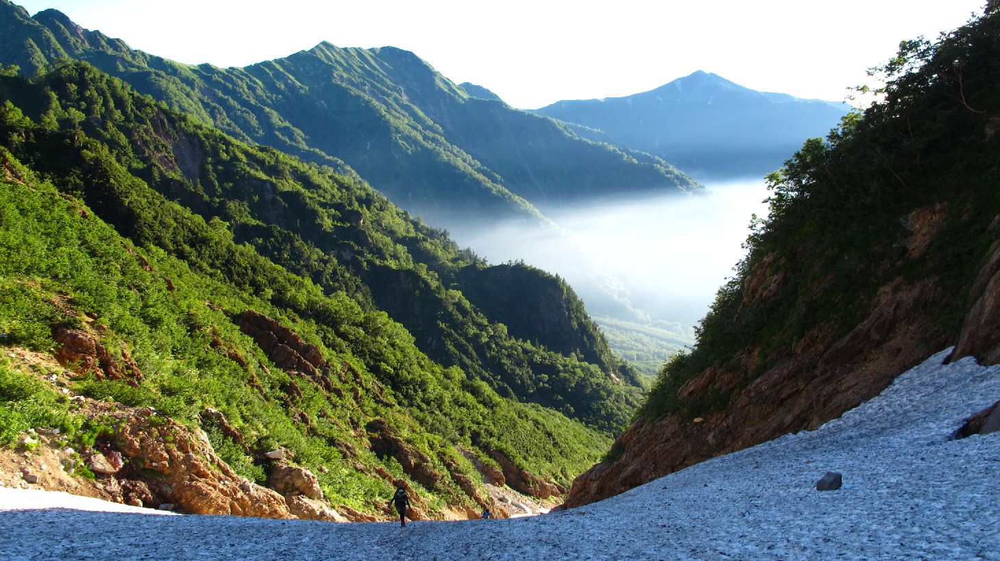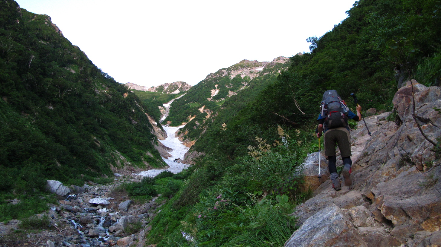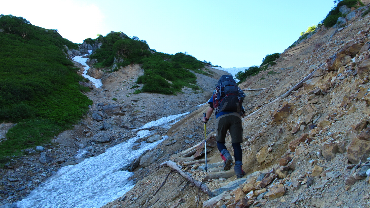 まだ時間も早いので、雪渓歩きもうちら二人とソロの方のみ!ユックリ景色を楽しみながら歩いて行きます