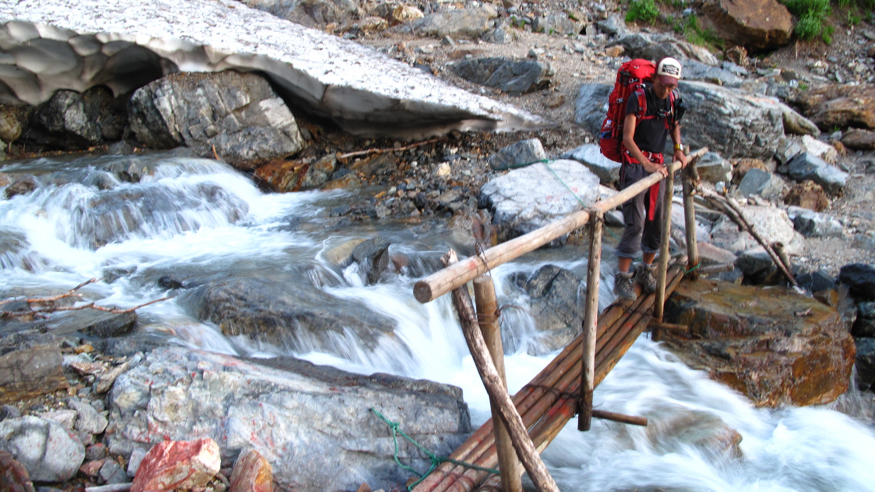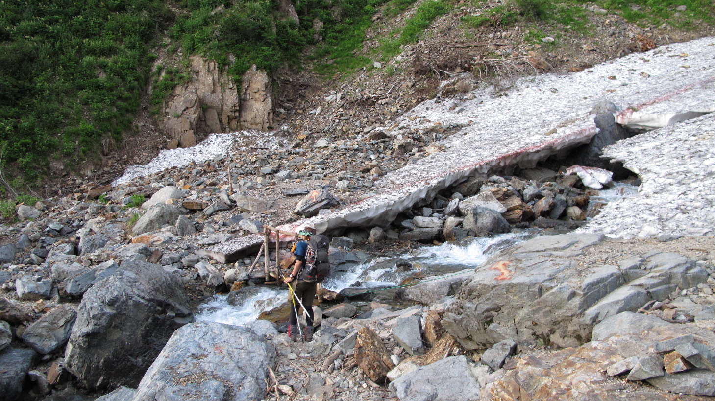 橋を渡り、ここから雪渓歩きの始まりです