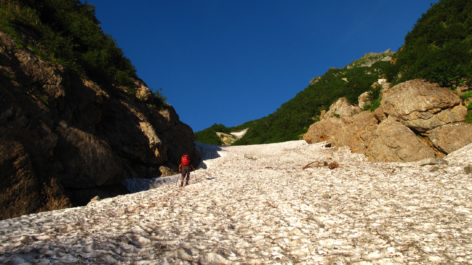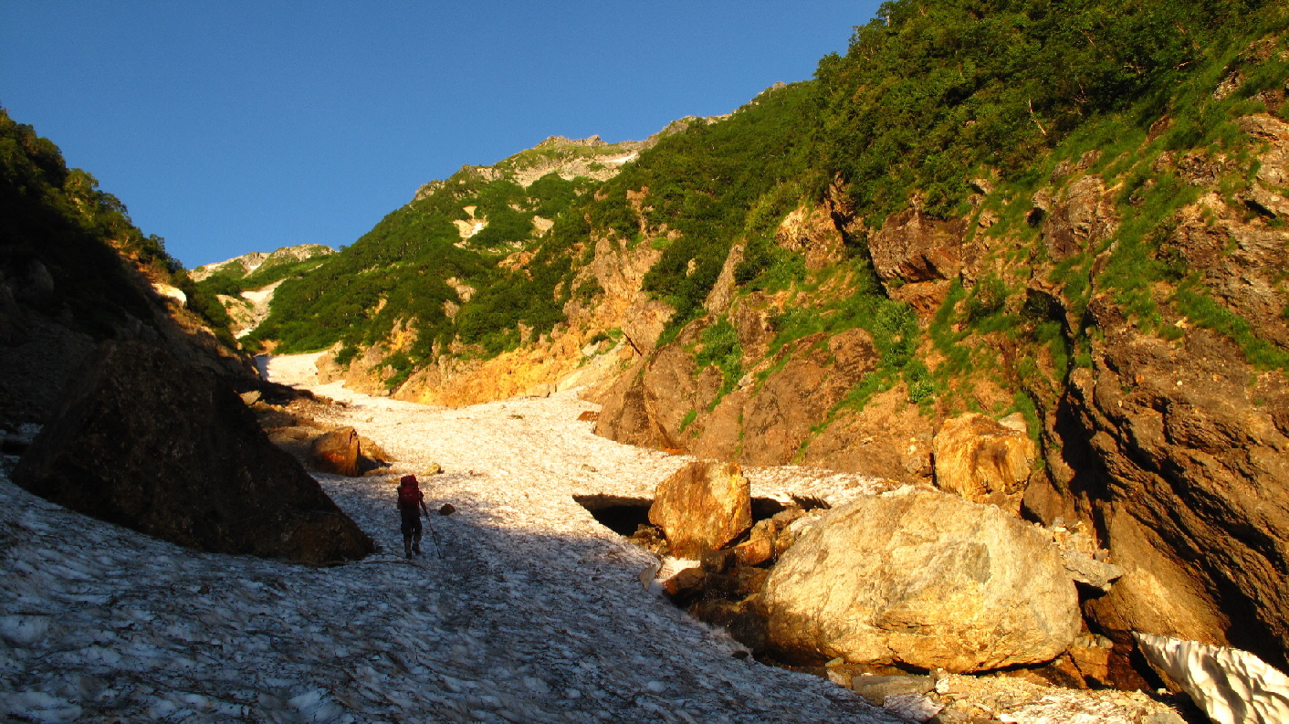 では、そろそろ雪渓を歩き始めます