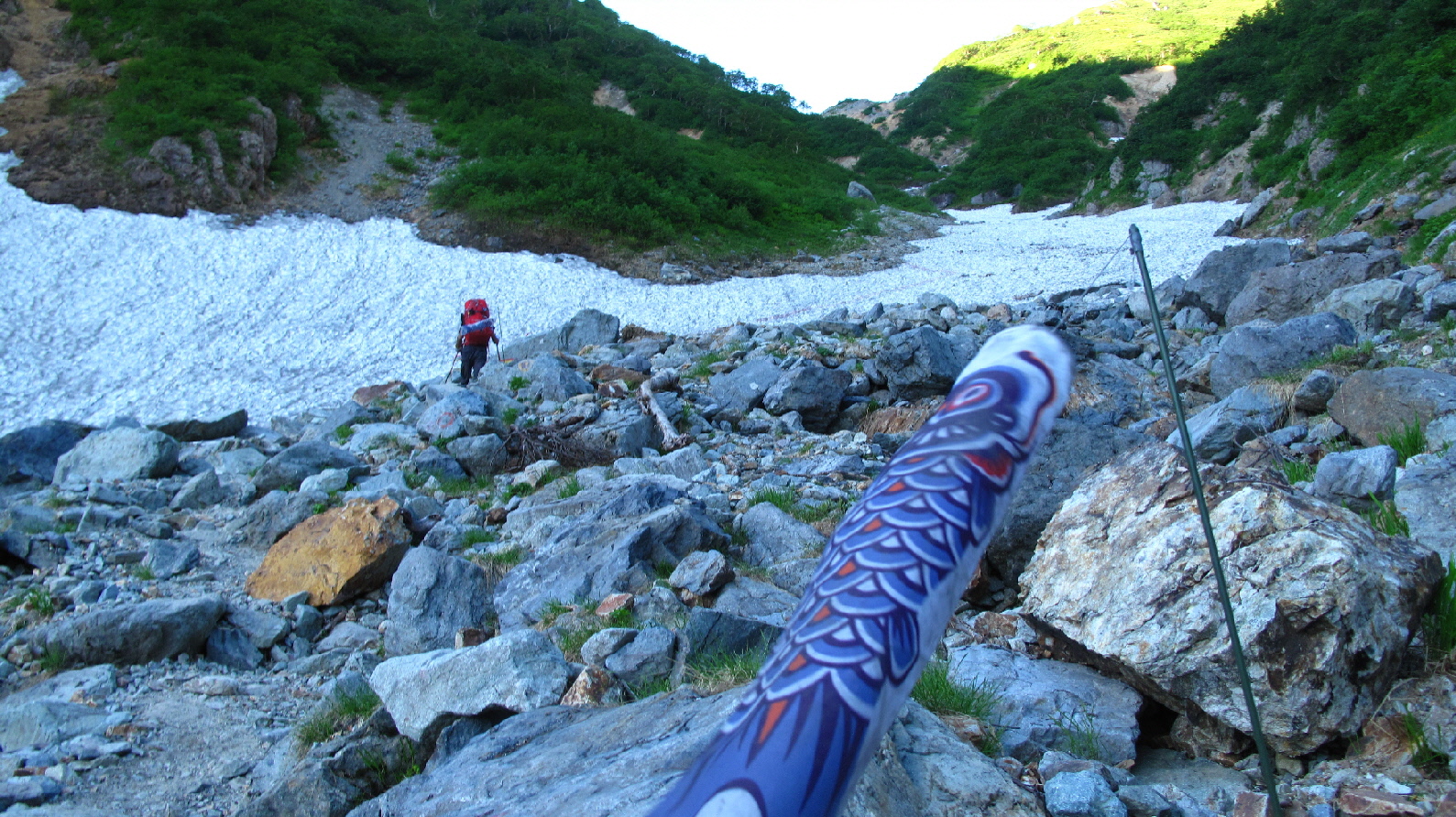 青空の中の雪渓歩き!鯉のぼりを目印に