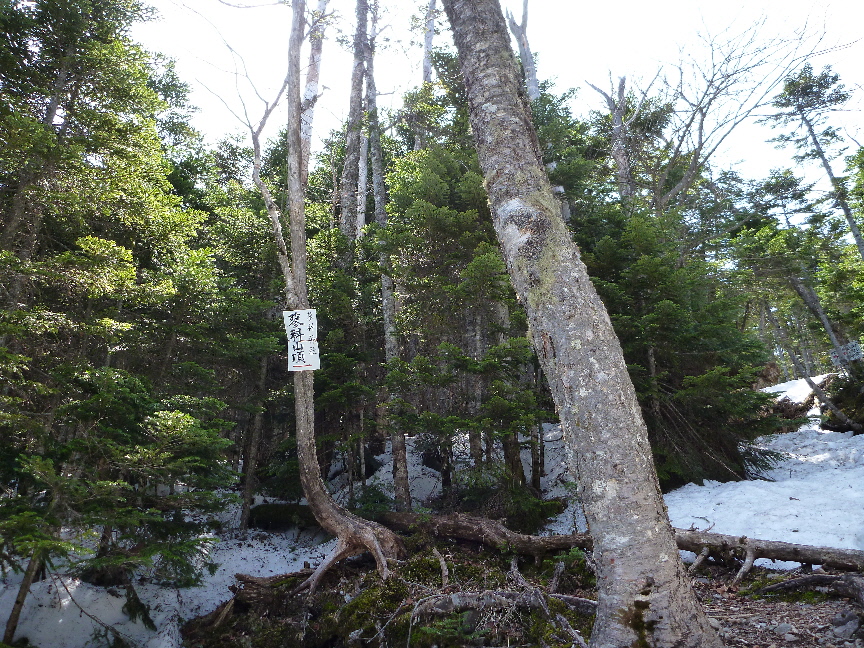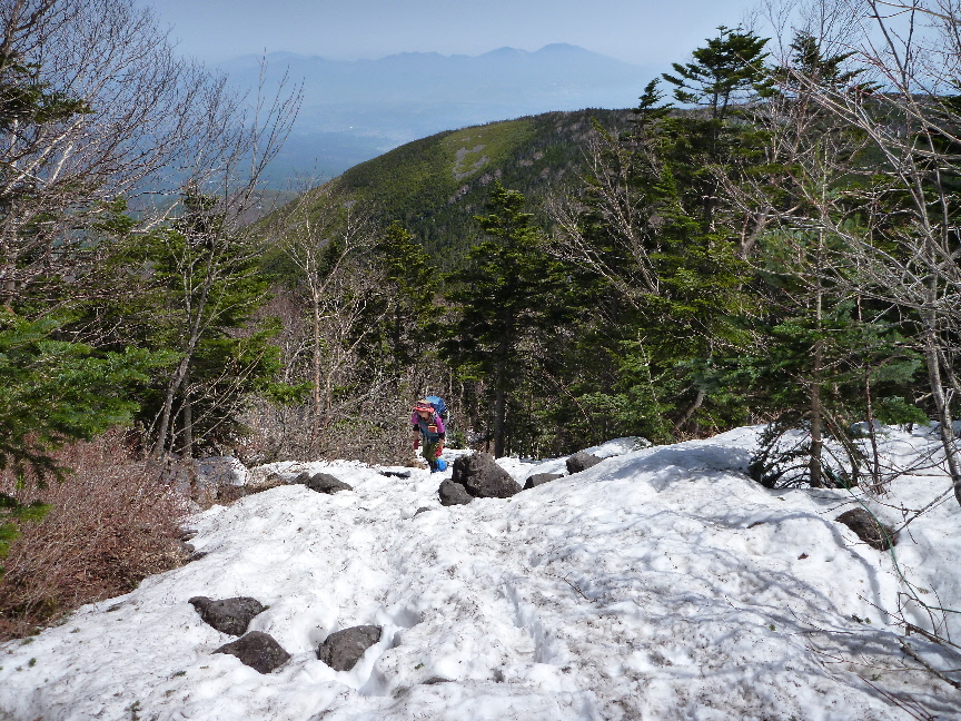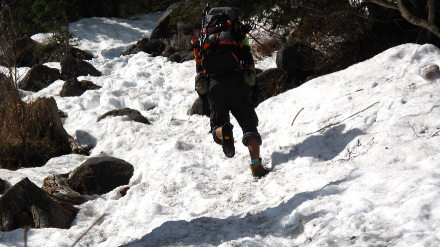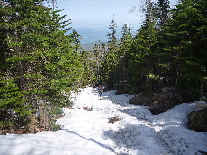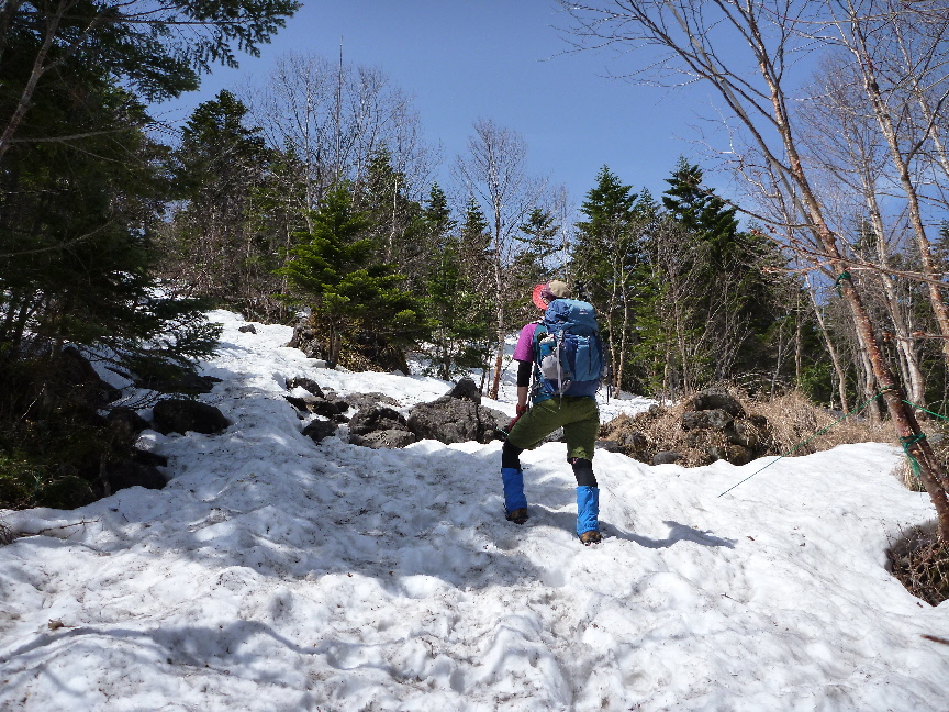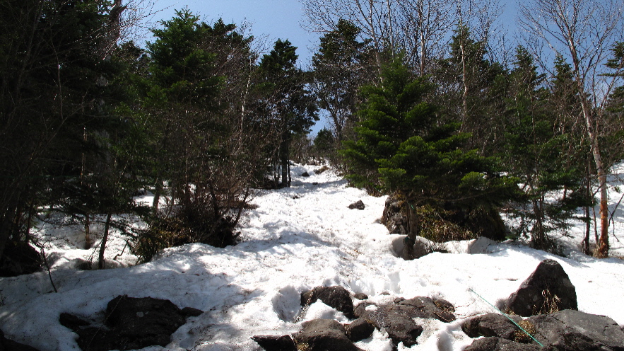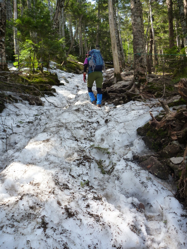 この平坦な道がずっと続けば良いけども・・・ 日の当たらない樹林帯は、雪がまだ残っています