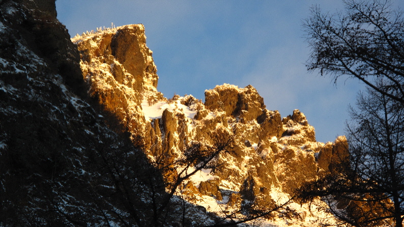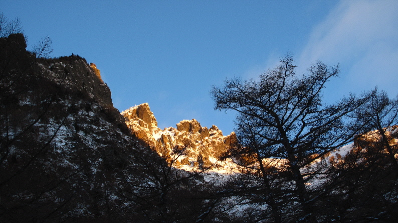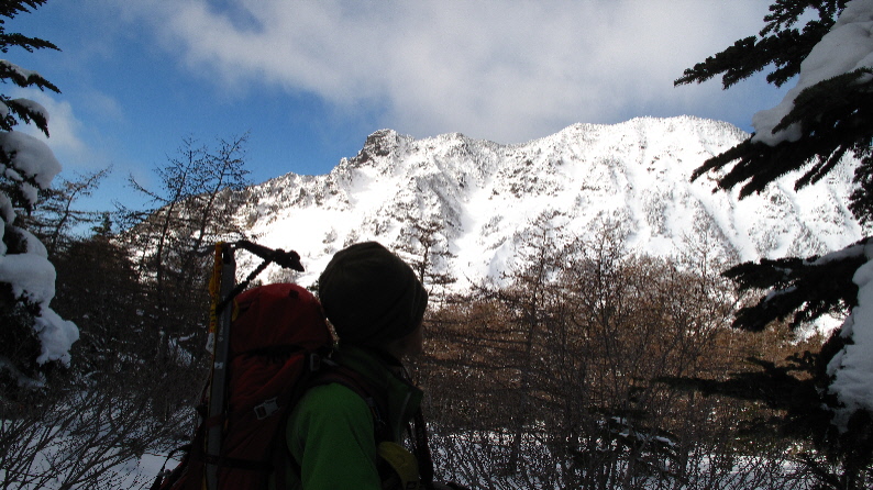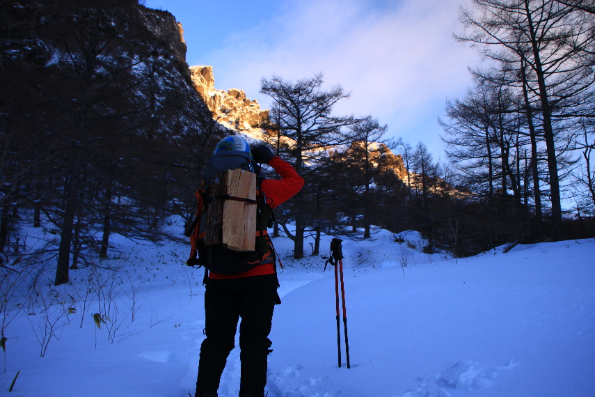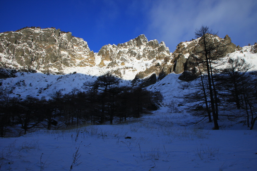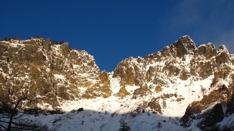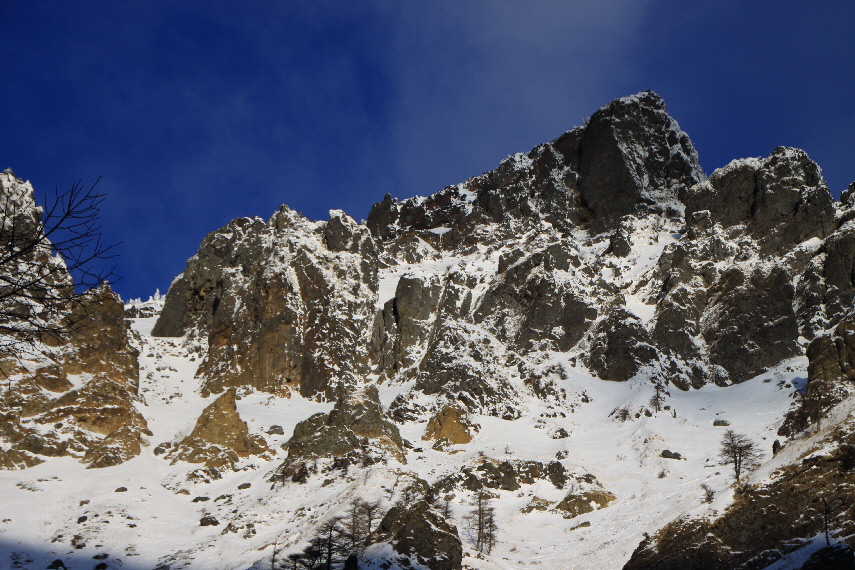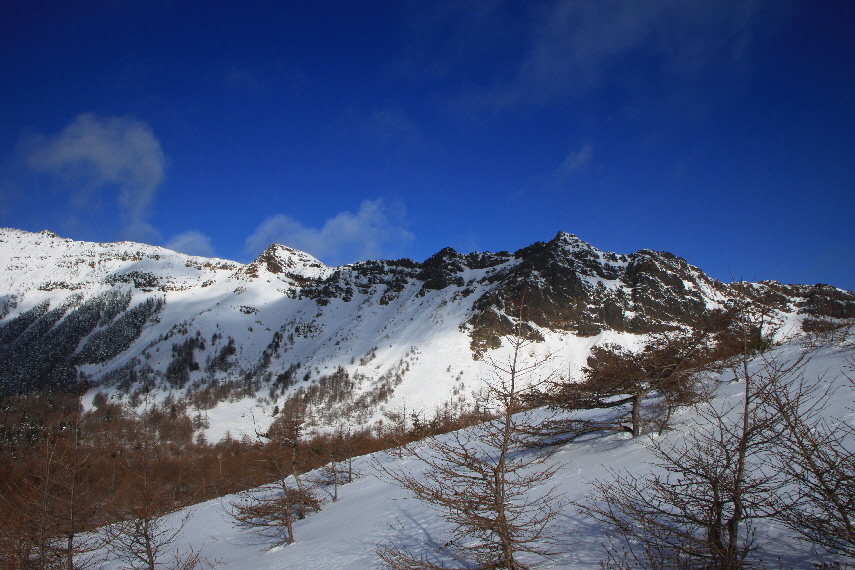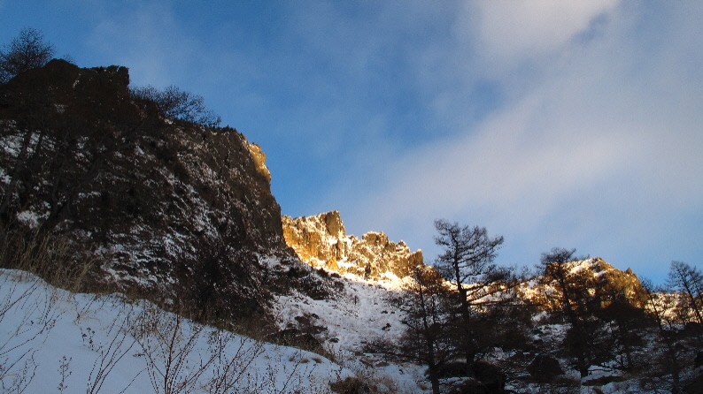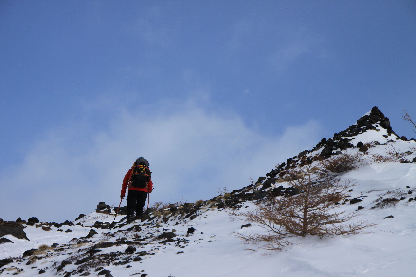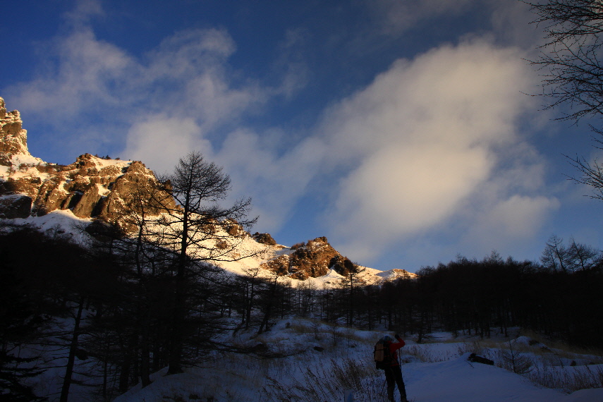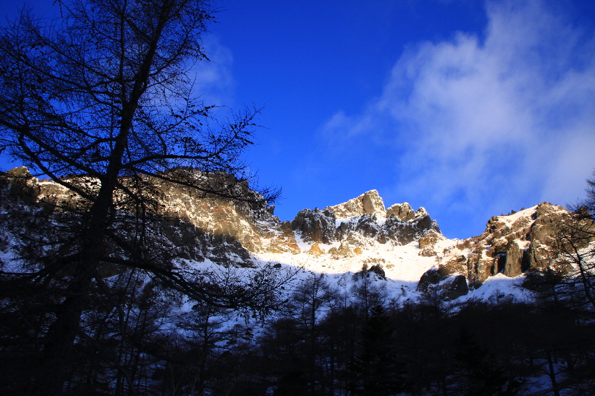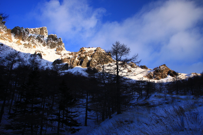 雪がうっすらかぶった岩稜と青空が良い感じぃ