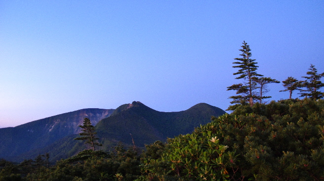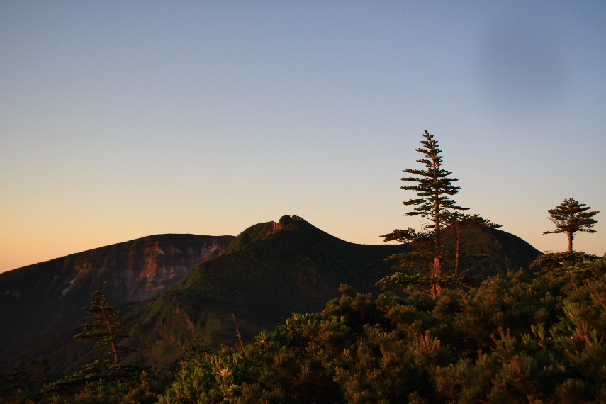 そろそろ歩く準備をします 天狗岳も赤く照らされてます