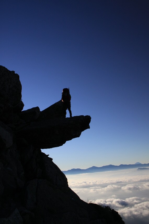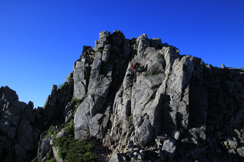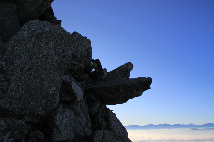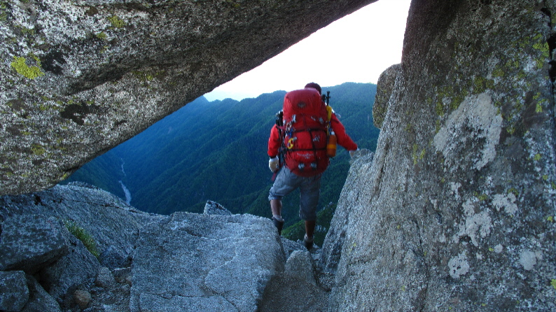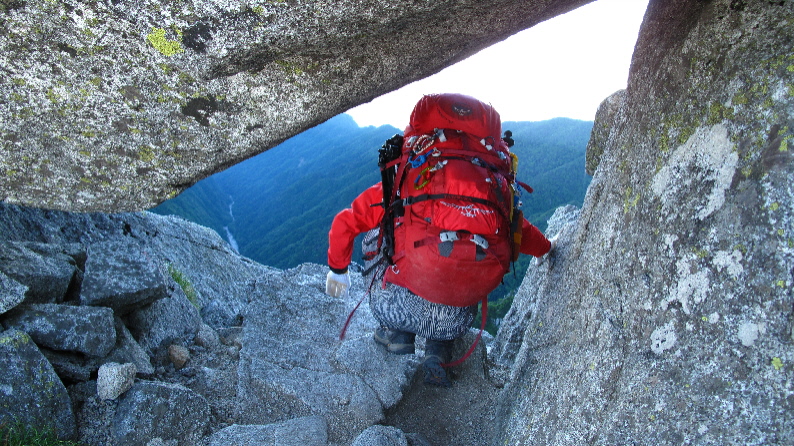 宝剣岳から下って間もなく行くと、岩が迫り出したところがあります