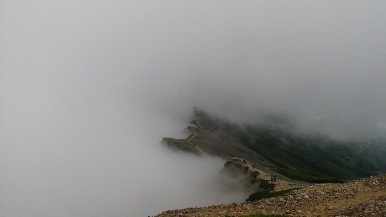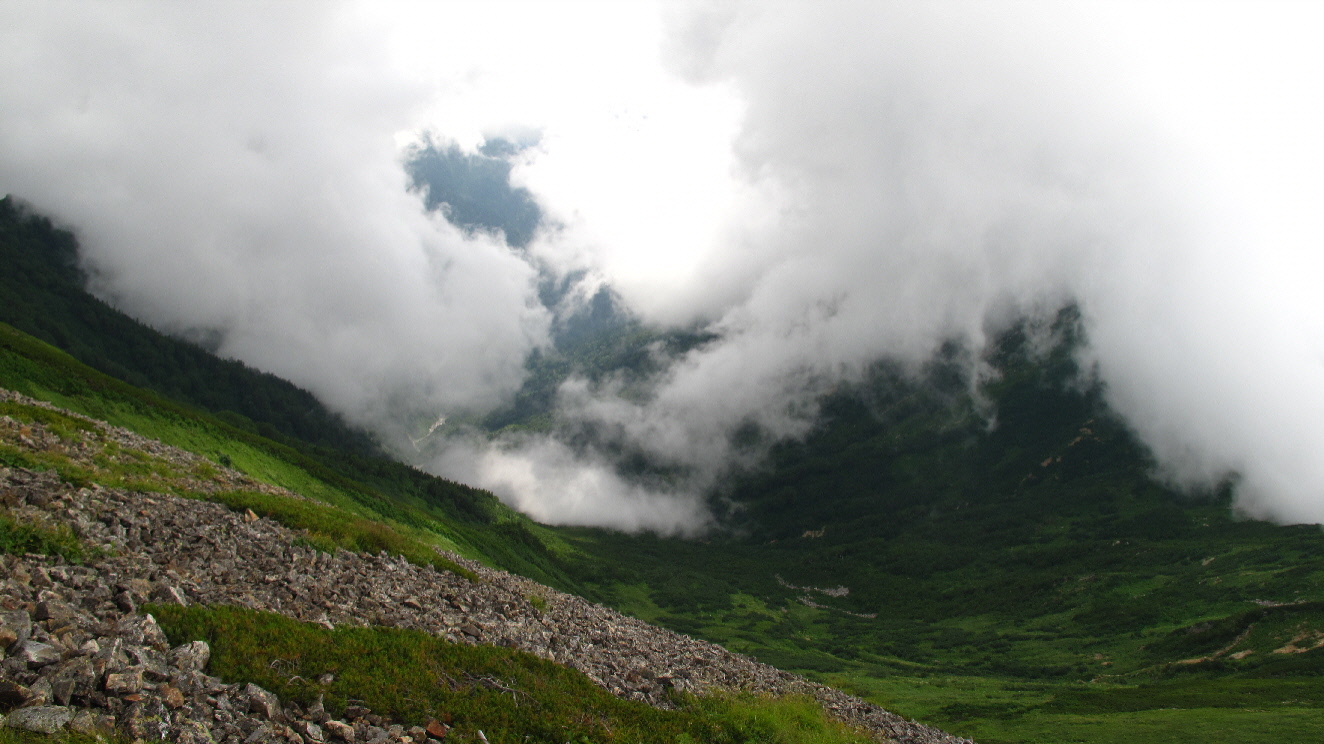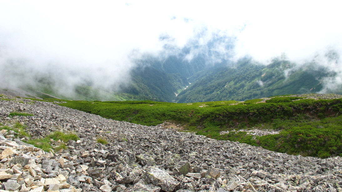 ガスの隙間から沢が見えます この下はに見えるのは下ノ廊下とかかな~?