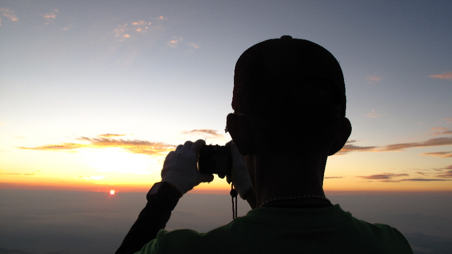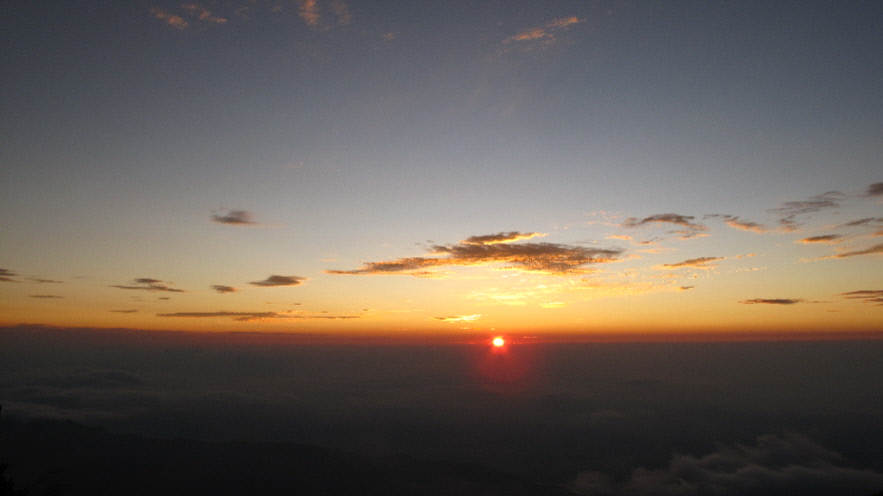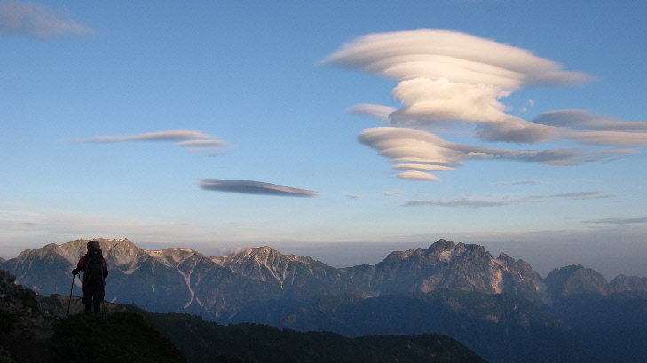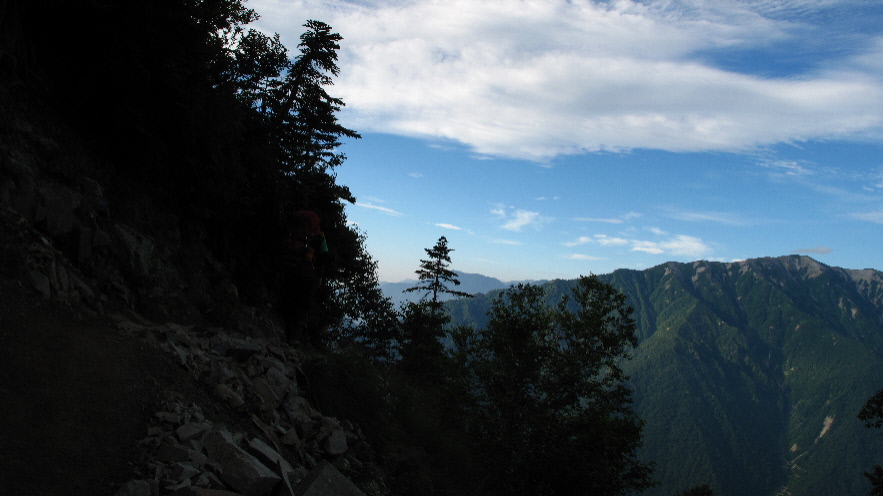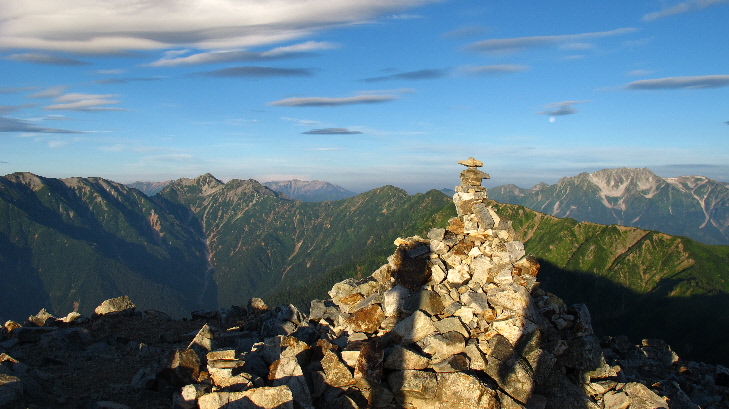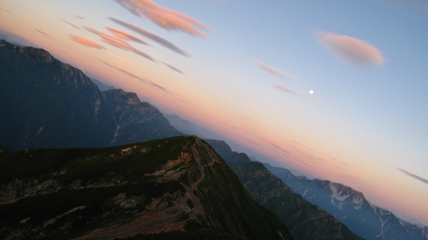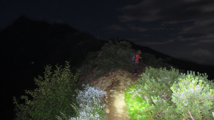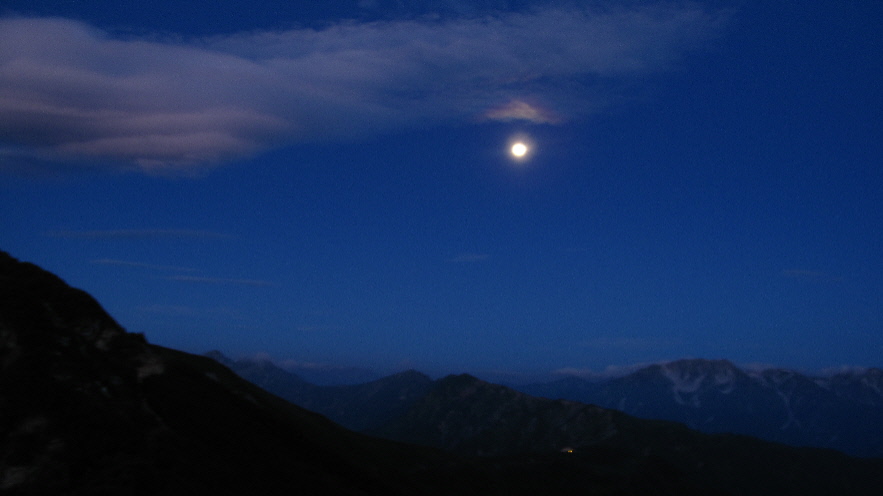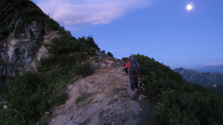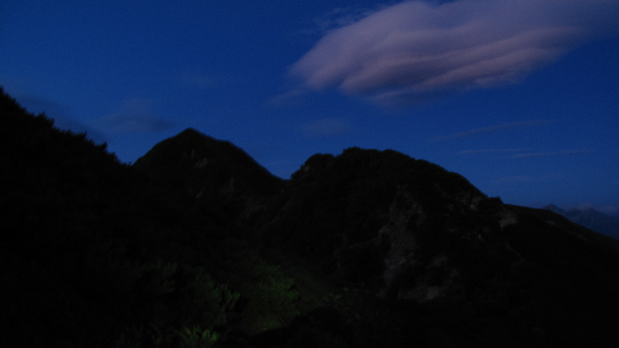 笑樹林帯を抜けると、まだ薄暗い中・・・月明かりもあって周りの山々が見えてきました