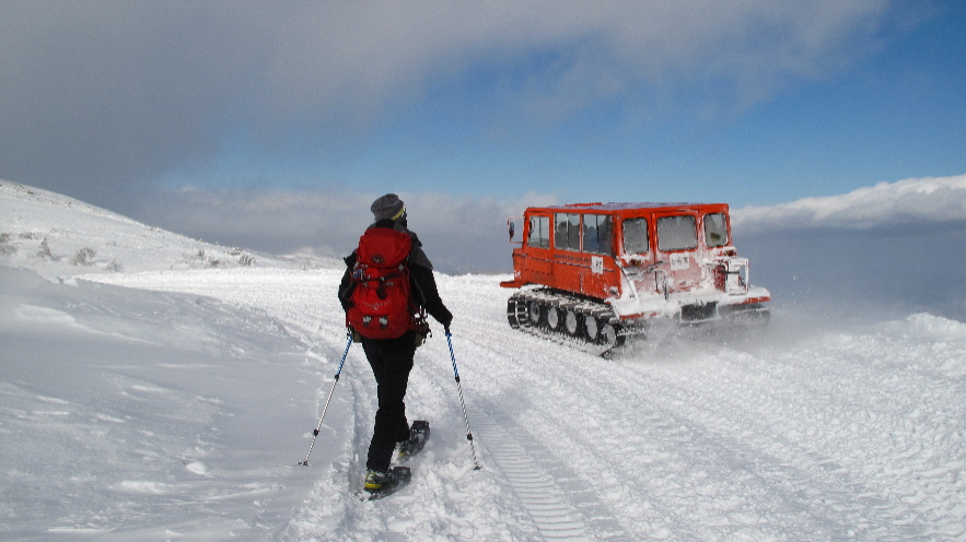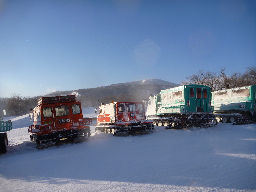 雪上車がミニカーのように見えます