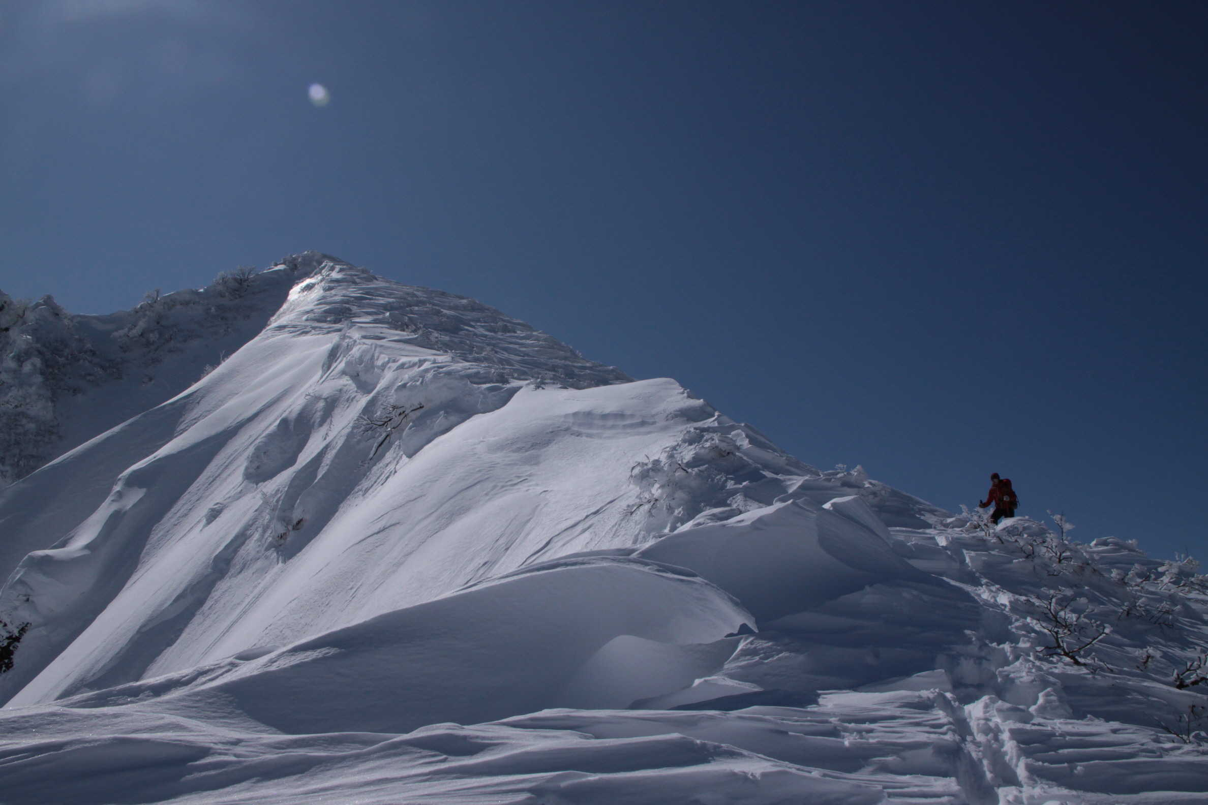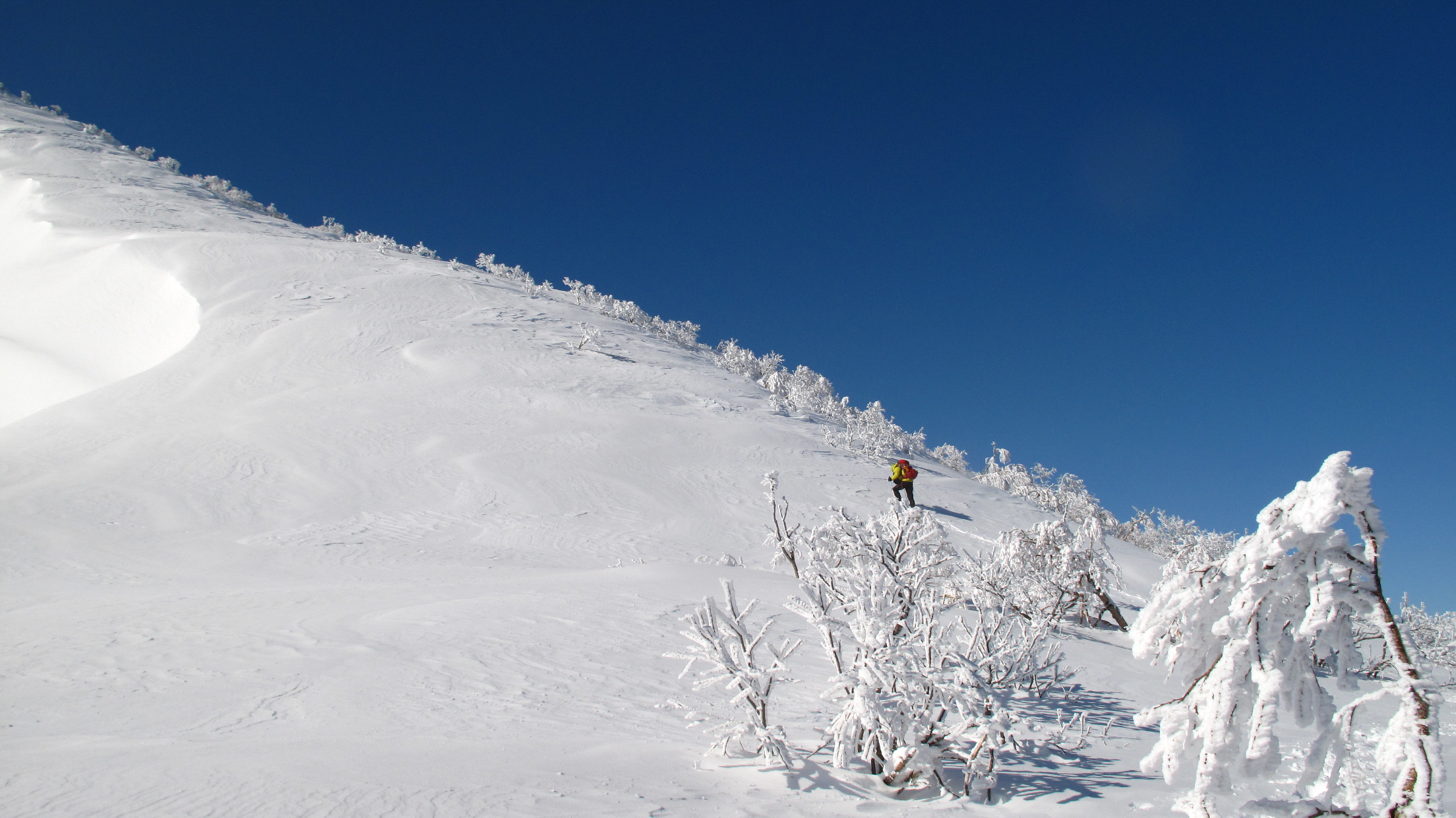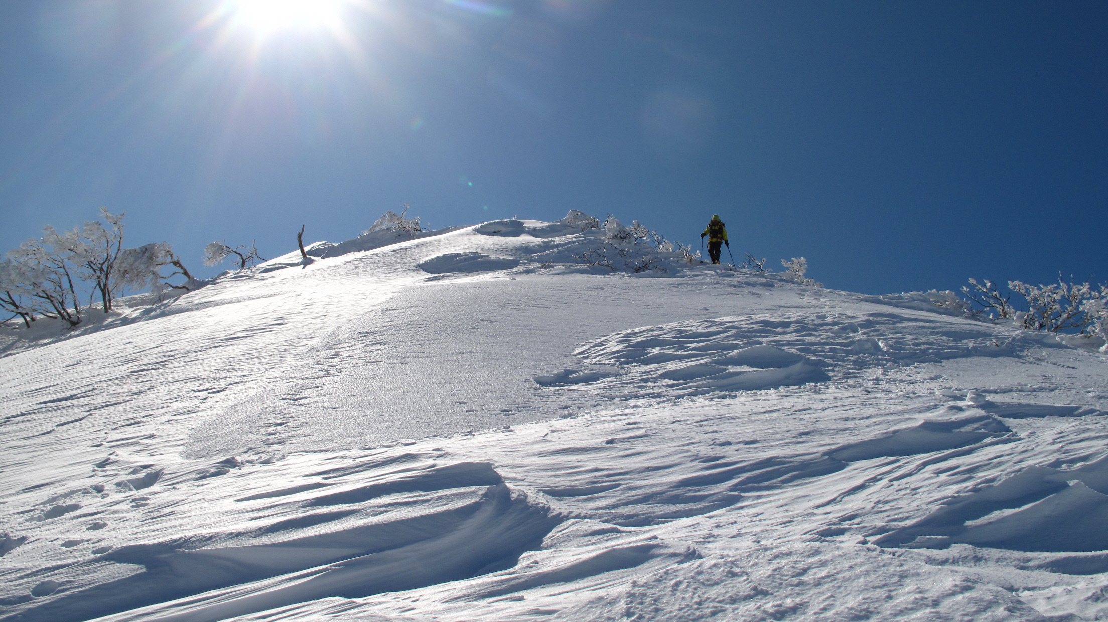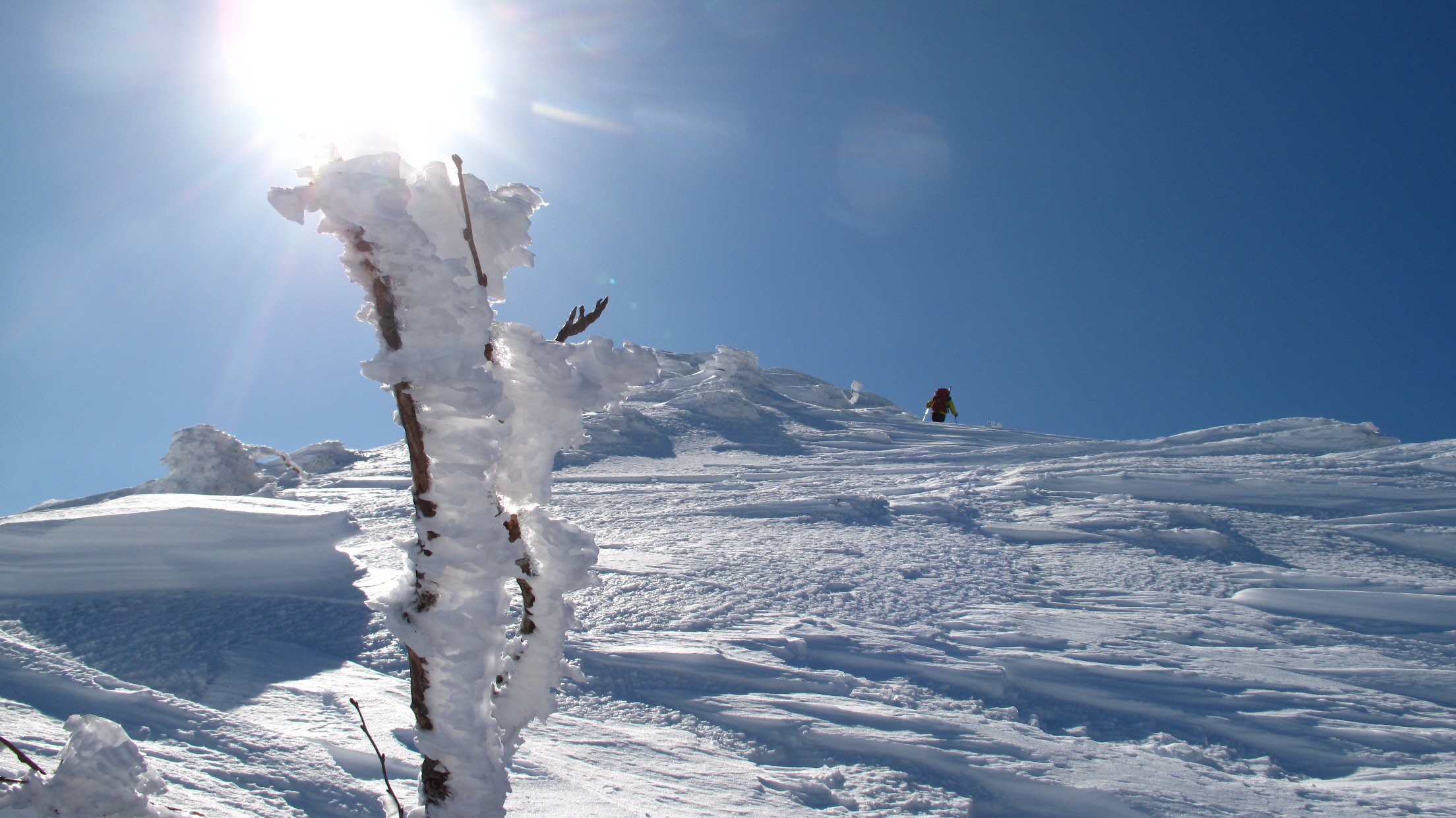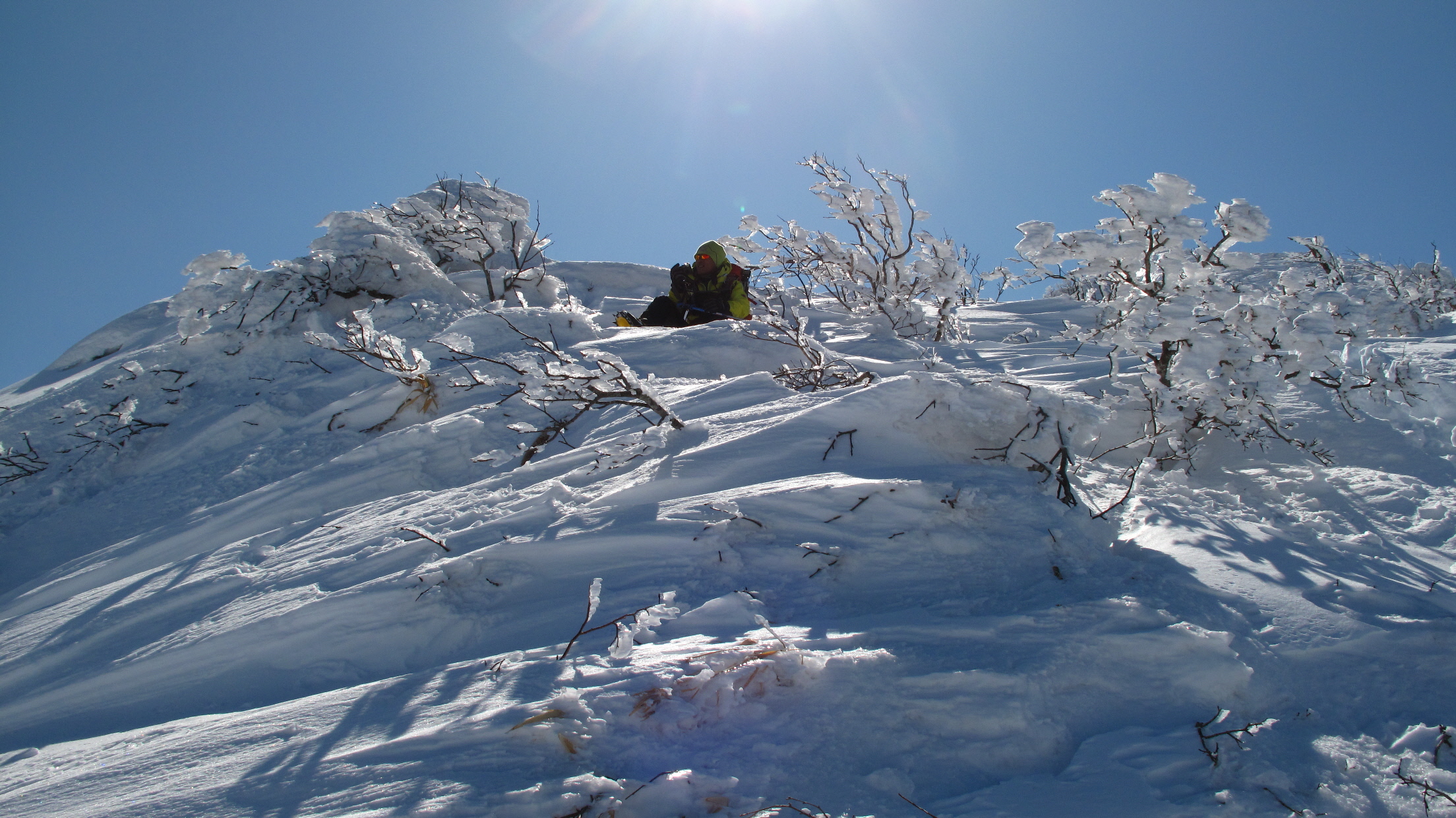 ちょうど、スノーシューを回収して少し休んでいたら、ソロの男性の方が登ってこられました
