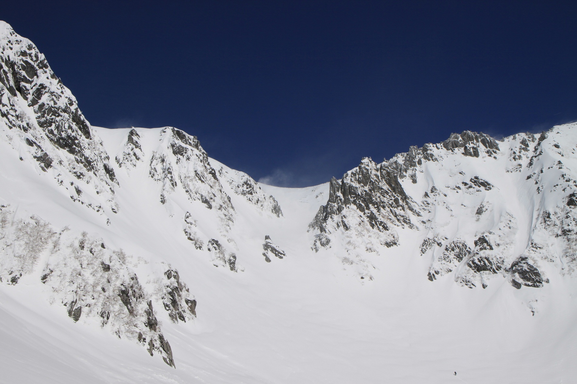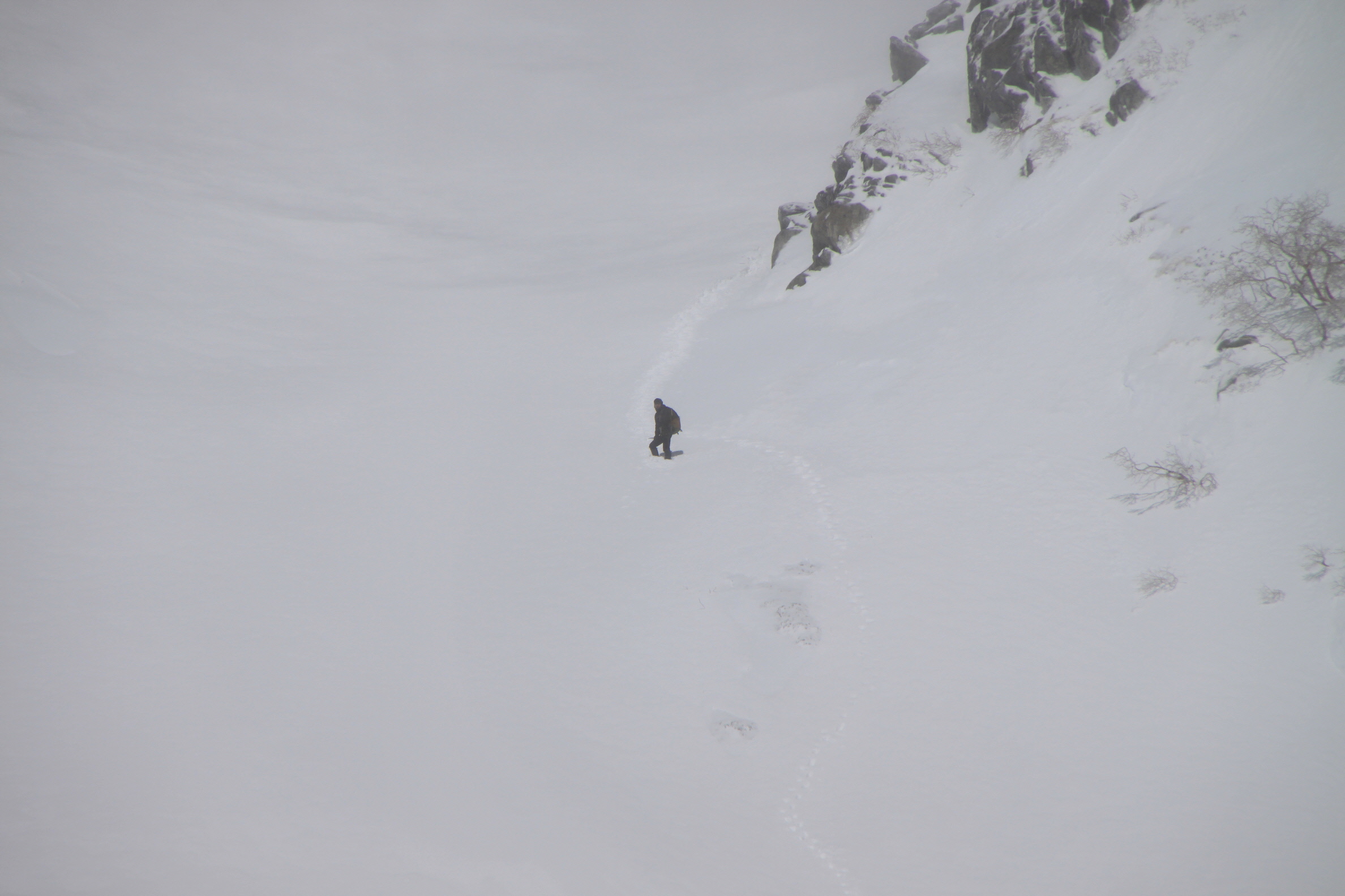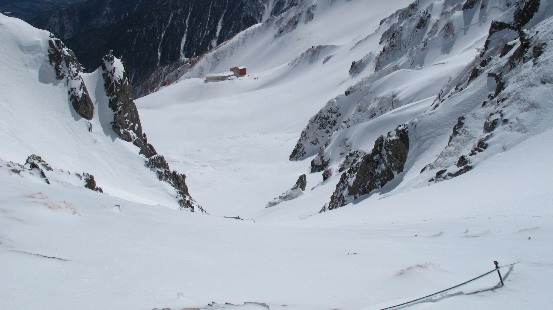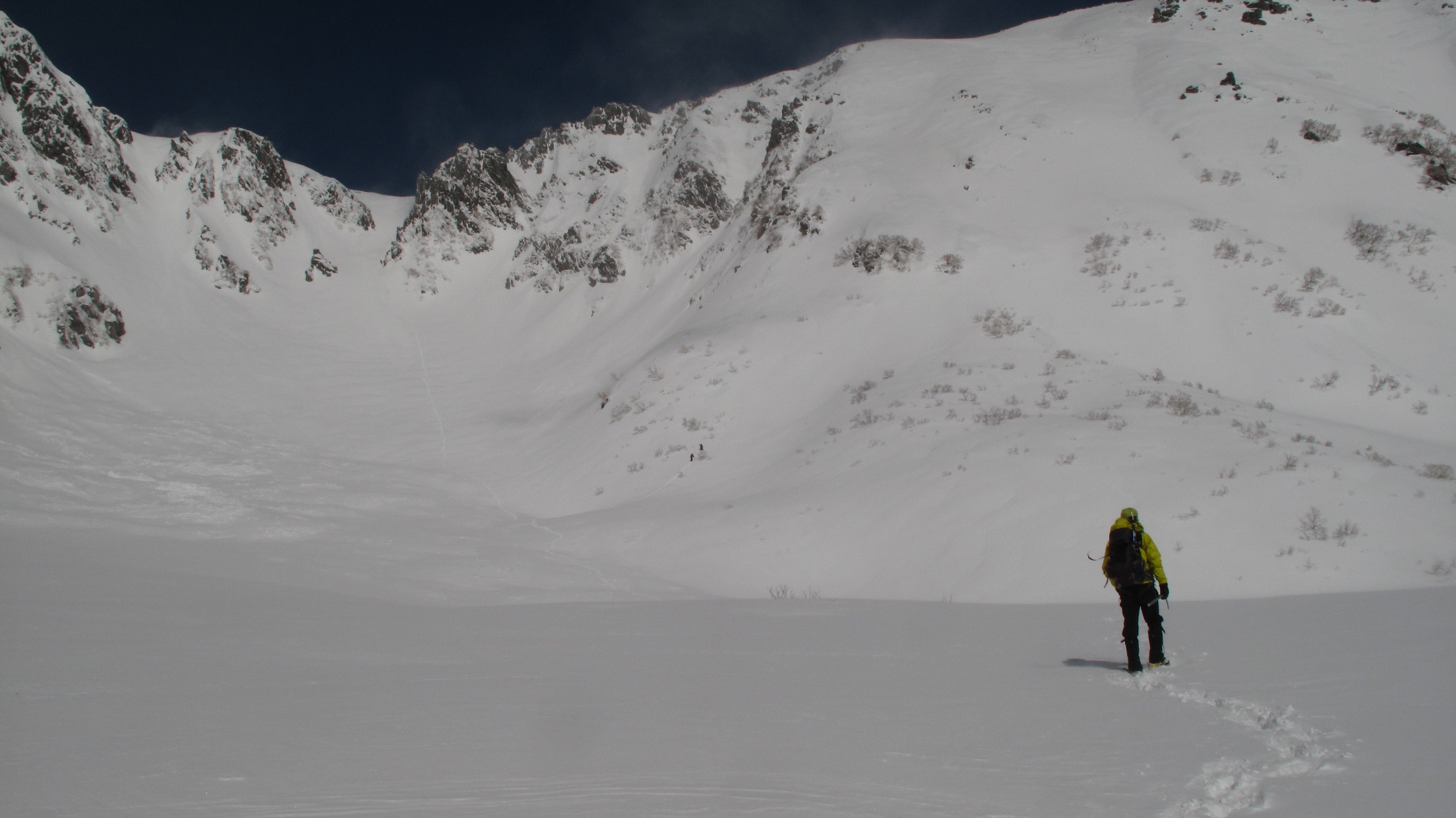 雪崩れる心配はあるけど、ココを下って行く方が乗ってきた方を下るよりは怖くないかも・・・と二人とも思ってました