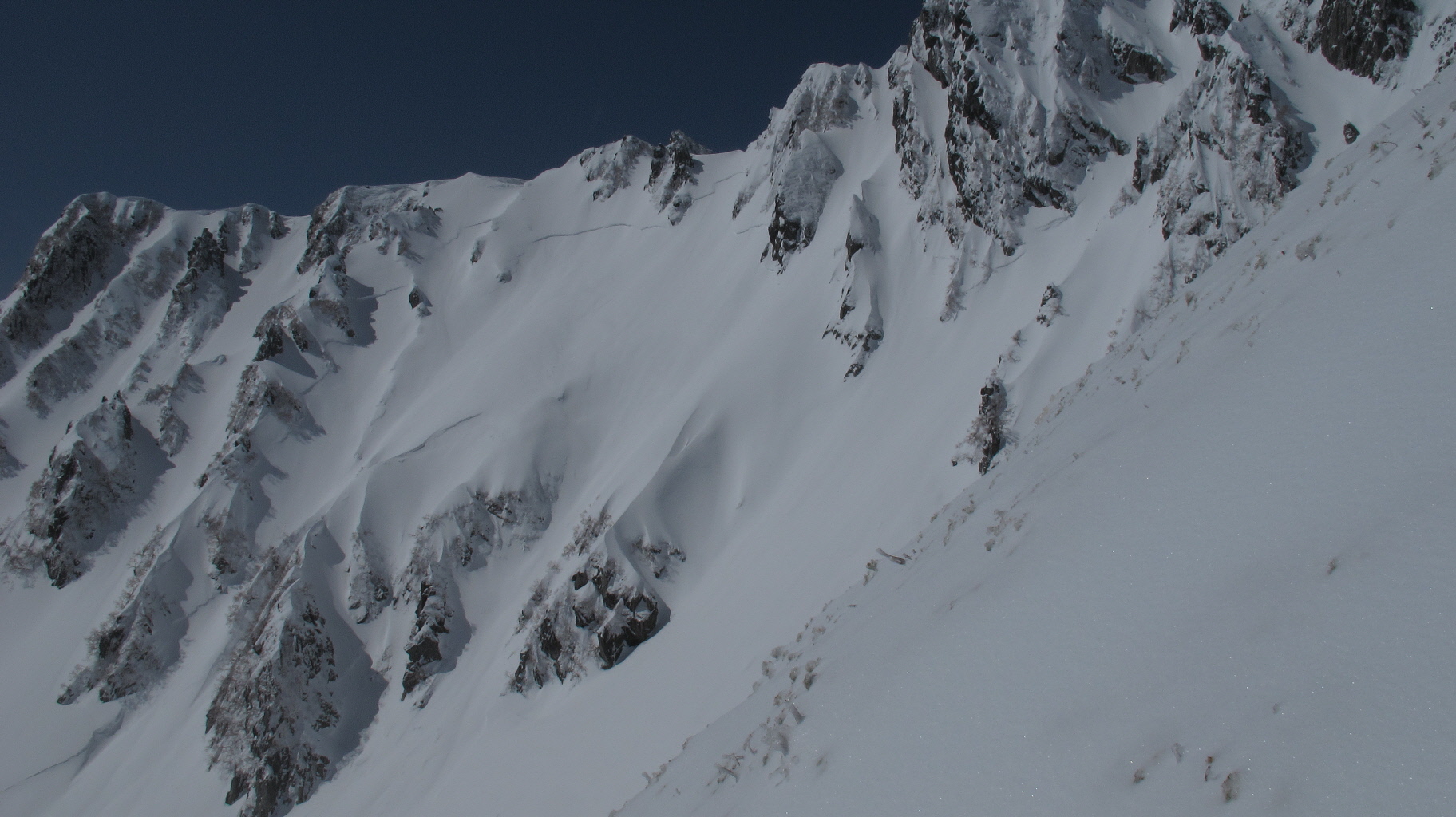 亀裂が入っているのが良く見えます あそこから一気に雪崩れる可能性も・・・