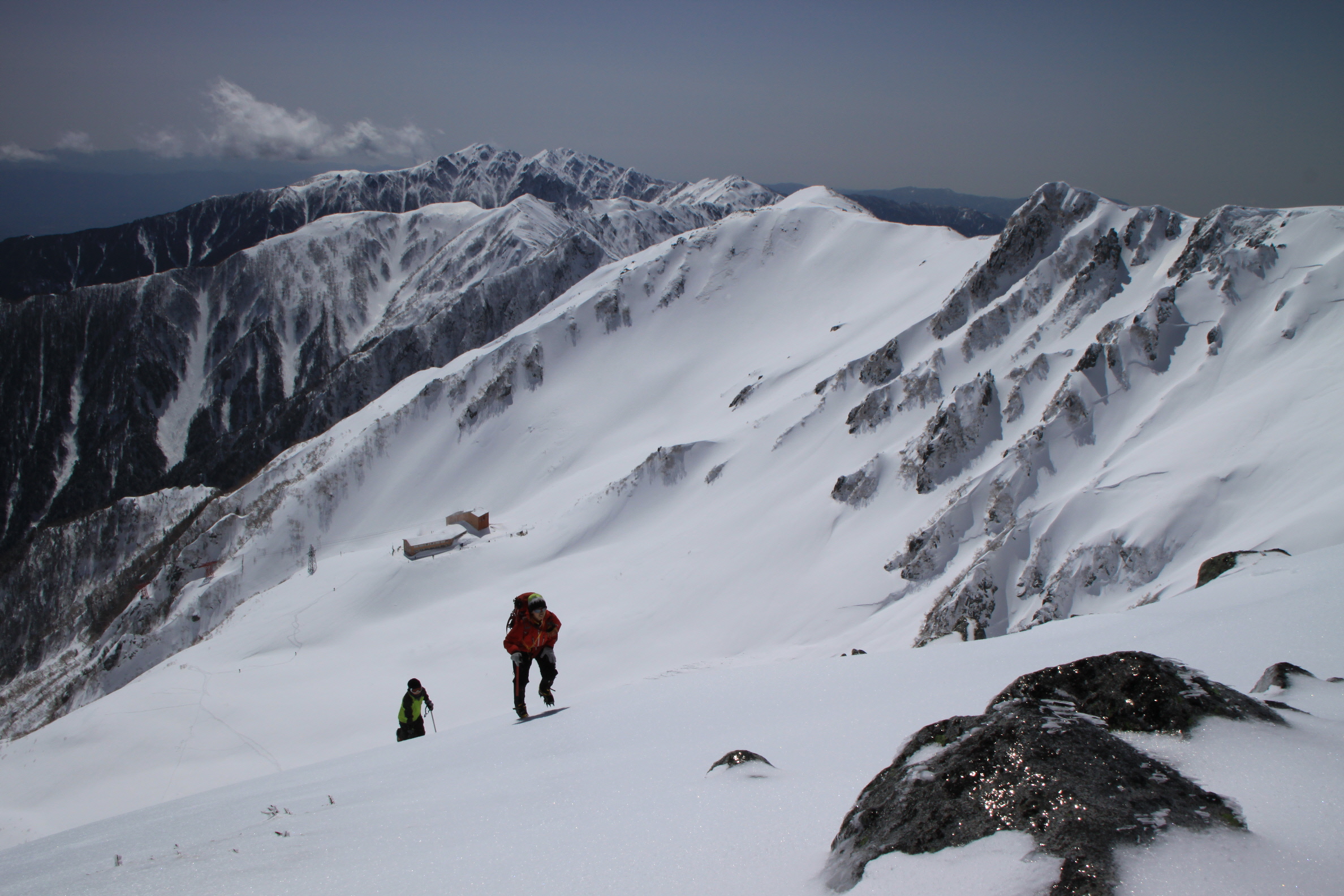 奥には宝剣岳 手前には頑張って登る相方Mクン